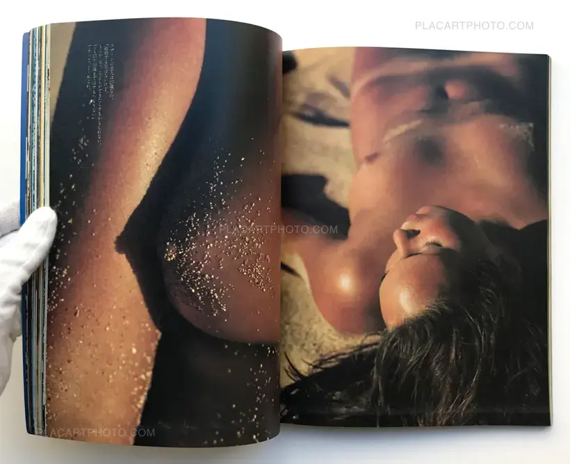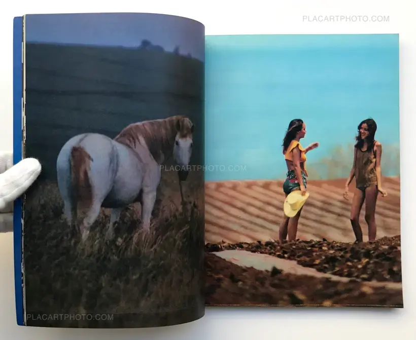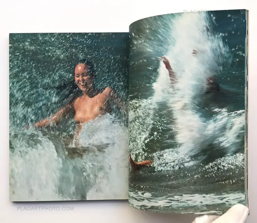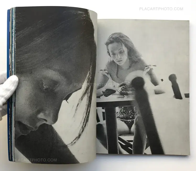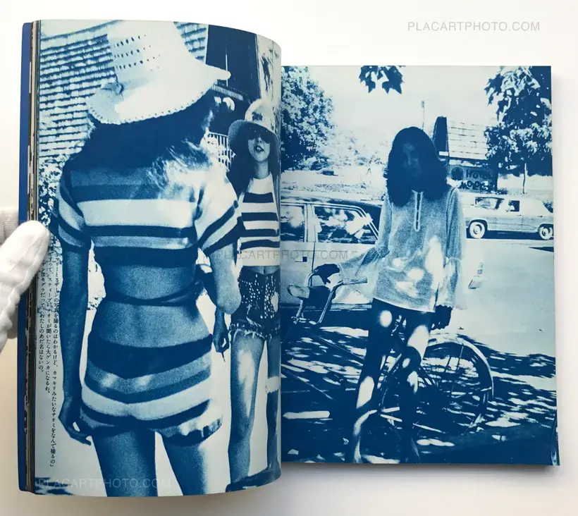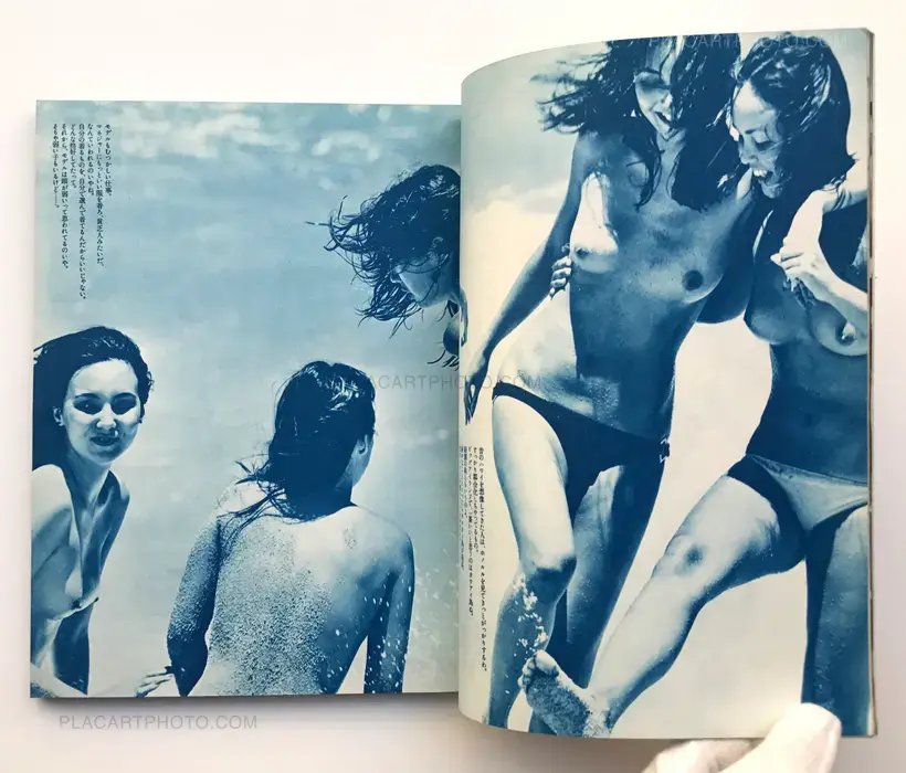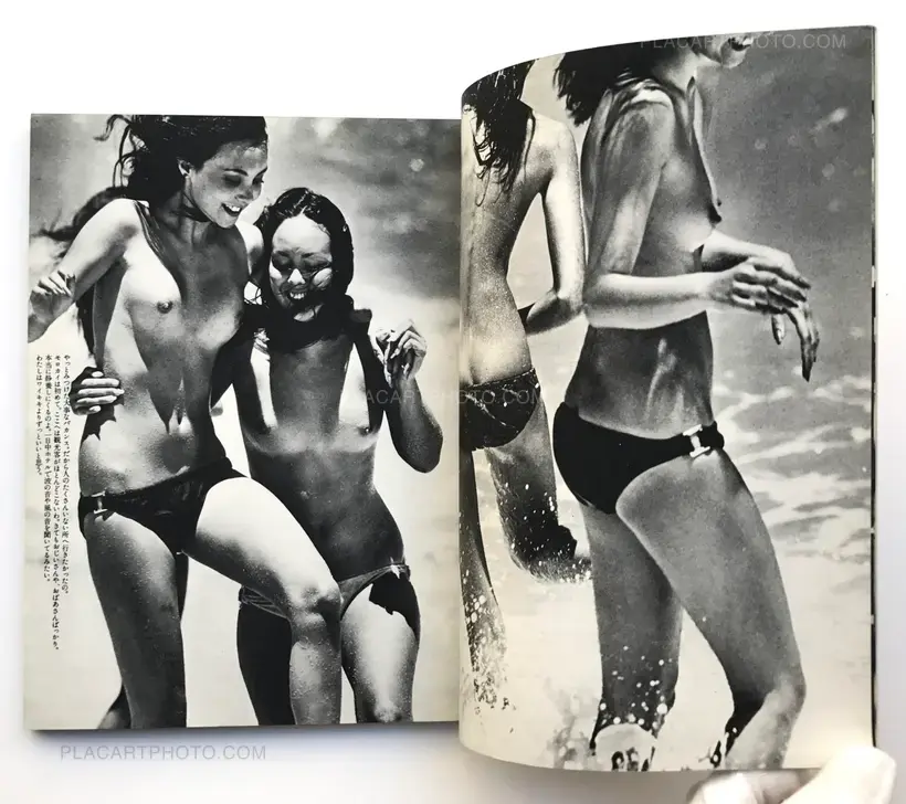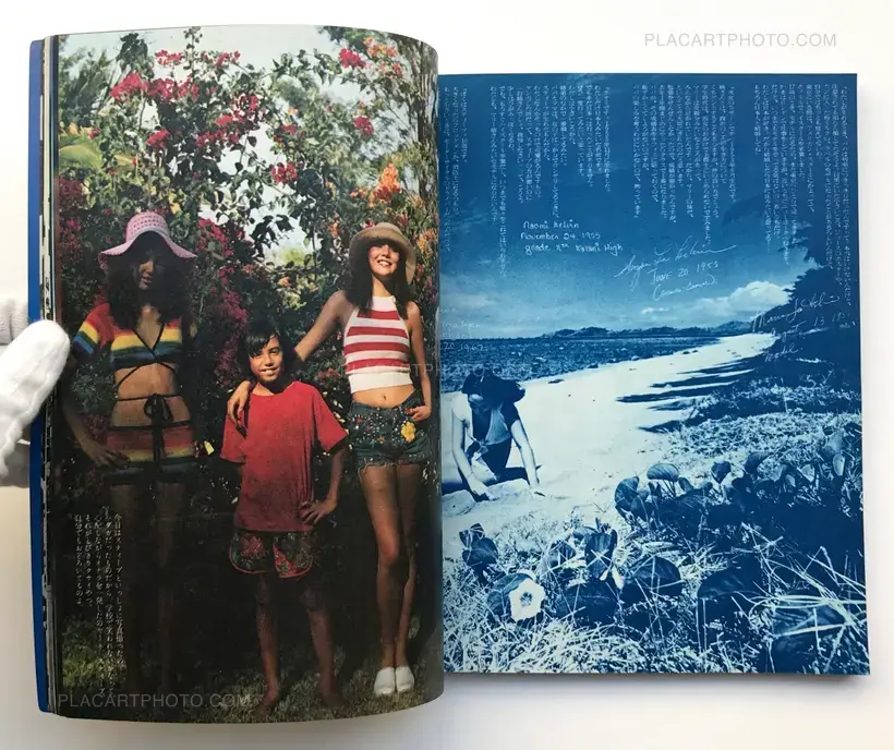 The model Marie, her younger sisters and brother spend a week of shooting in the Hawaii island of Molokai : Kishin Shinoyama doesn't miss a thing and succeeds in taking impressive shots of the casual intimacy of both the beautiful young women and the handsome young boy. He plays with great fortune with grains and colors: the choice of alternating series in colors and blue, green and sharp-contrast black monochrome in Hai ! Marie strongly reminds the reader of the fine Olele Olala (1971). A great special issue with a nice layout and different colors of paper who make the book very pop!