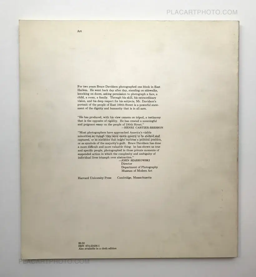 For two years Bruce Davidson photographed one block in East Harlem. He went back day after day, standing on sidewalks, knocking on doors, asking permission to photograph a face, a child, a room, a family. Through his skill, his extraordinary vision, and his deep respect for his subjects, Mr. Davidson's portrait of the people of East 100th Street is a powerful statement of the dignity and humanity that is in all men.
