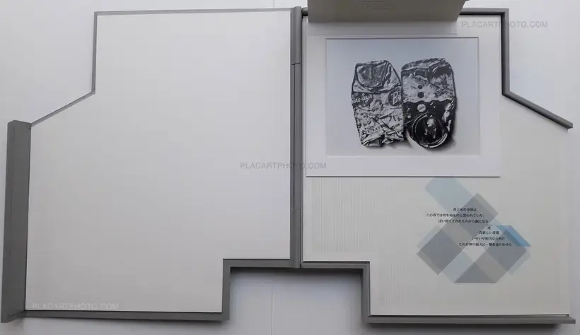 The photographs belonging to Tin Ashes were taken in the early seventies. They represent crushed soda cans found in the streets of Tokyo and arranged as a tableau. The images remind us as much of New Realism as of Andy Warhol in their borrowing of the same ambiguous rapport to the icons of consumer society with that particular blend of fascination and critique. Araki’s “petchancola” have inspired Michel Bulteau to write six poems full of the spectre of death and the “practice of old witches or sorcerers”. For the poet, the cans represent funeral urns designed to carry ashes and bones. The poems, translated into Japanese, are printed as overprints with a two-coloured mesh, resulting in what resembles modular origami, some of which are assembled to form a decorative whole. The traycase takes its inspiration from the steep slopes that crown most buildings in Tokyo and its choice of material–painted plastic recalls contemporary Japanese architecture.