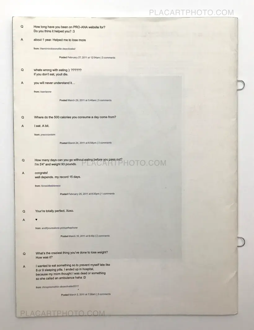 The Pro-ana community has turned anorexia (Ana) into its dogma. They venerate the illness giving meaning to their totalitarian “lifestyle”. It’s a virtual reality where they state commandments, share motivating tricks and exchange hundreds of images of thin models via their blogs. They have created Thinspiration, a visual new language - obsessively consumed to keep on wrestling with the scales day after day.