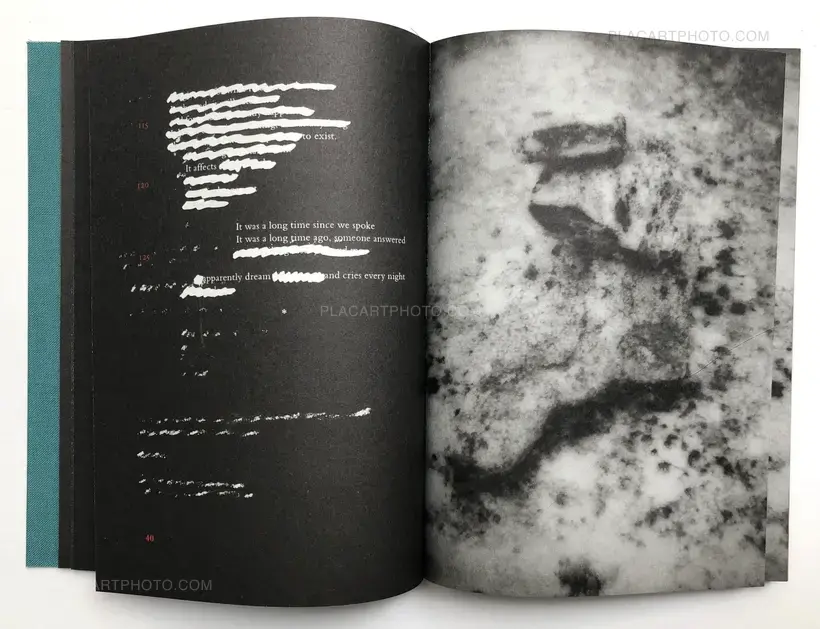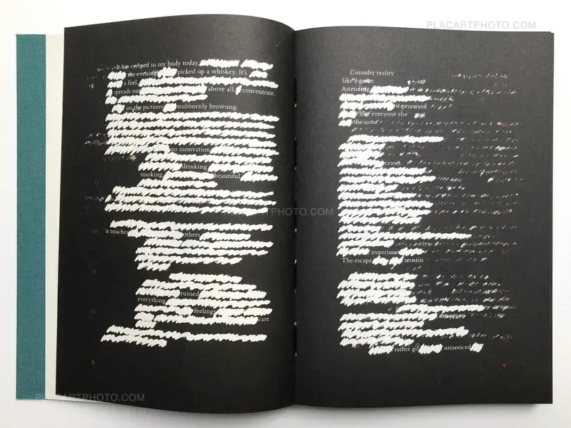 From this long stream of consciousness’ notes, very few parts are intact in the final book. After selecting and narrowing down the final script, Ström thought it was not honest enough. "By removing I was revealing. The text in itself is not mutilated. Its voice is louder by presenting it this way. You get the story, it becomes more sincere. One can see this text either as images or as words. It does not matter to me. How many images I have gone through to end up with this selection? Are the images mutilated by the way I have treated them? I believe they sing."