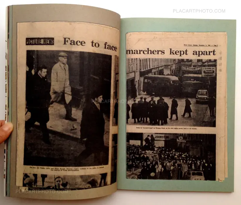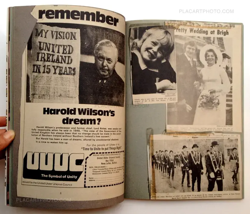 This has been made all for the love of scrapbooks. For about three centuries in many different countries, a scrapbook or album became the most immediate manner of diary making. In Ireland, this often took on a particular and idiosyncratic form. From the late 1960s until the early 1990s, the turmoil of Northern Ireland was often reflected in these hand-constructed books. Clippings from newspapers, family photos and personal mementos often found their way into highly individual collaged records of daily life. Donovan Wylie and Timothy Prus have recreated a non-sectarian version with the benefit of hindsight. Wylie, son of a mixed marriage, grew up in Belfast during a period when identification with one side of the sectarian divide or another was an essential component of everyday life. Scrapbook gives nothing but the authors’ personal view of an era and a kind of record making.