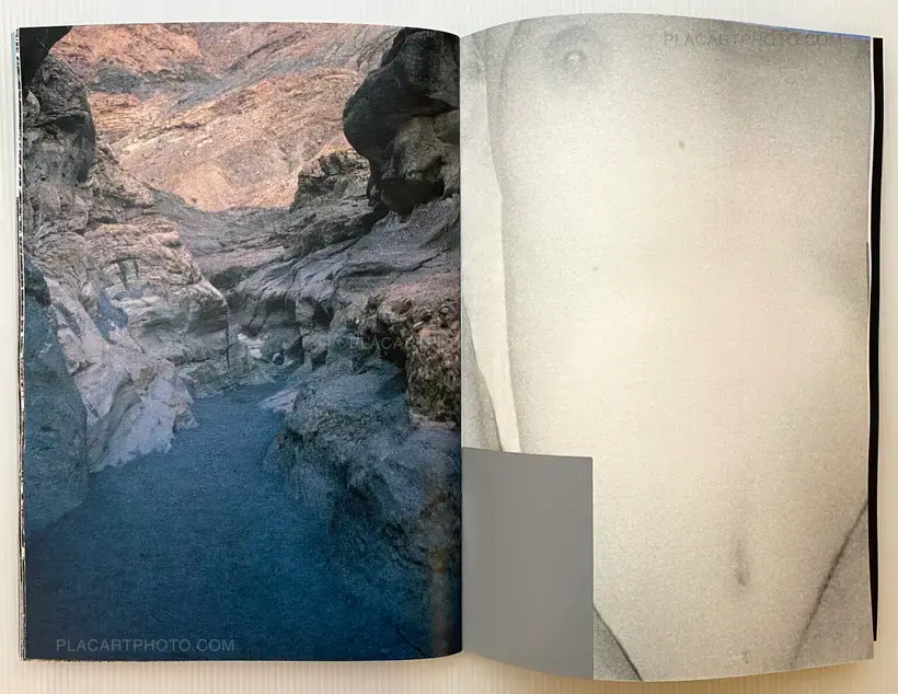 The publication POV consists of images of landscapes and human bodies superimposed upon each other, sometimes in a harmonious manner, sometimes dissonant. The page layout favours the dialogue between images, alternating between views of nature and body details. Certain images are masked by grey vignettes made of a film which can be scratched away. These grey masks, as well as suggesting the censoring patches of social networks, are a manner of changing the passive reader into an active voyeur. One thing leads to another; led on by scenes of deserted landscapes an erotic lyricism gives way to pornographic images.