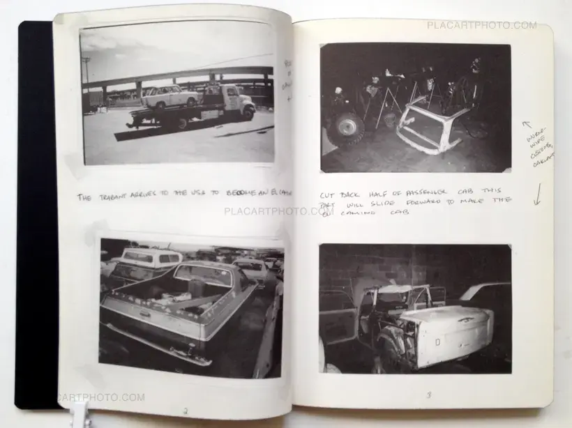 This instantly collectible limited edition artist's book, featuring rounded edges and nine blown-in, four-color photographic images, documents a recent project by the daring and witty young American artist, Liz Cohen. In 2002, the artist began the process of importing the Trabant, once the most common car in East Germany, to the United States. Upon their arrival, Cohen set to work converting these Communist-era workhorses into supped-up hybrid American El Caminos. Black-and-white photographs and the artist's notes explain the process, and the glossy, blown-in photographs show the scantily clad, stiletto-shod artist posing in typical calendar-shot, car-model form on top of and alongside her works in progress, sometimes accompanied by the real-life mechanics who helped her to reach her dream.