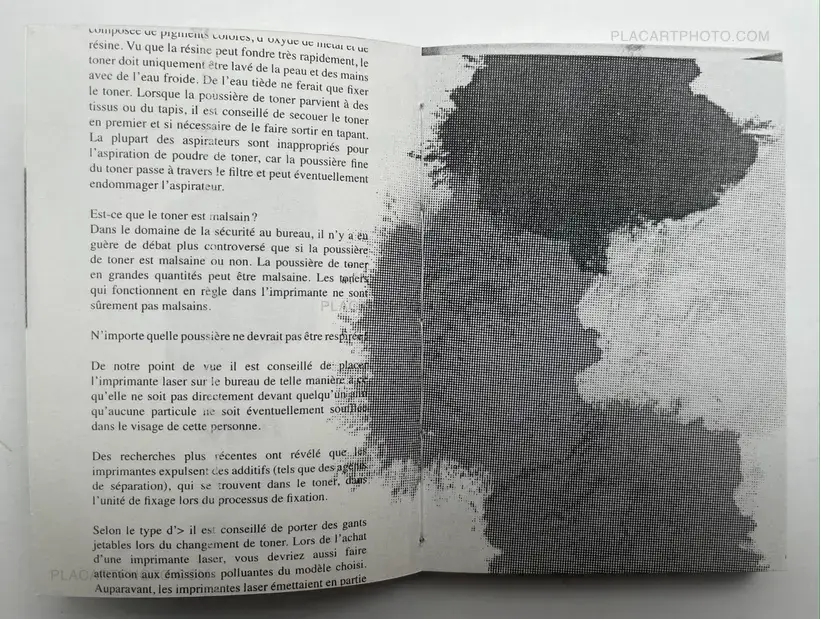 Printing devices are known to to emit chemicals into the atmosphere. Among the chemical contaminants emitted by printers we find the ozone. This molecule has been identified as being particularly irritating when inhaled. This is one of the of the reasons why this book, printed with toner from a laser machine, is to be be considered as a notif.