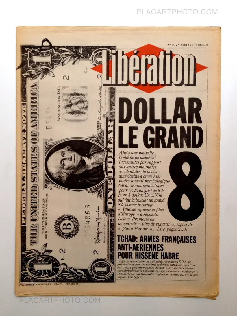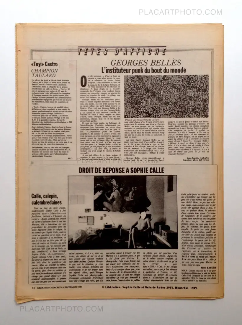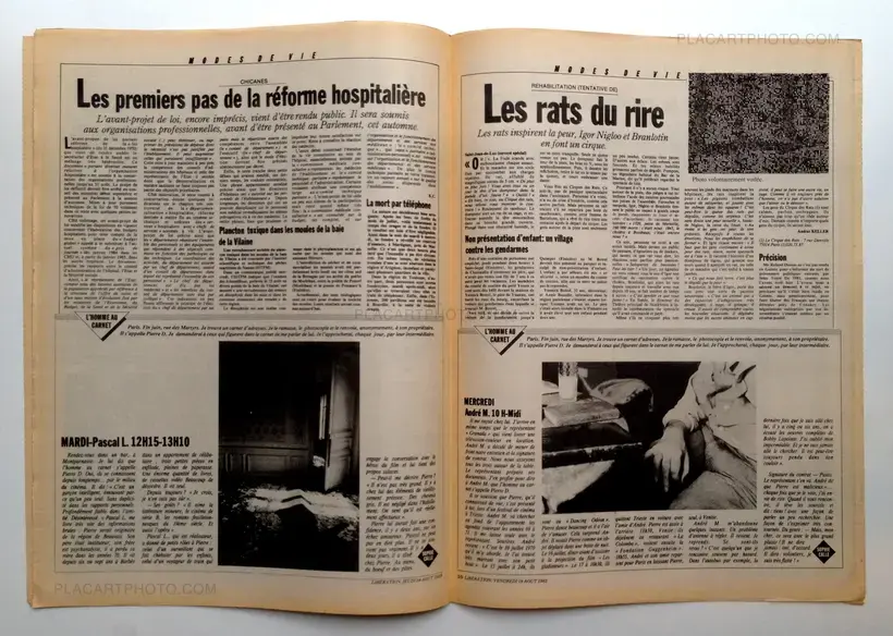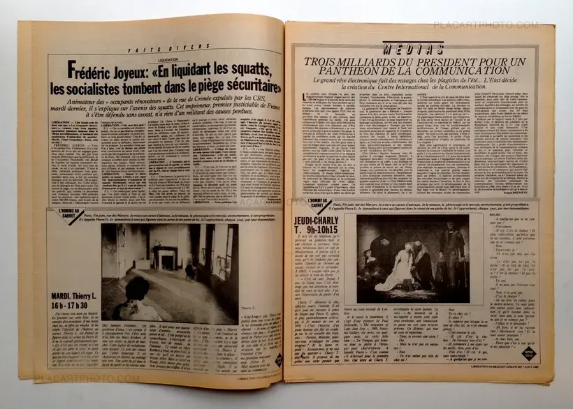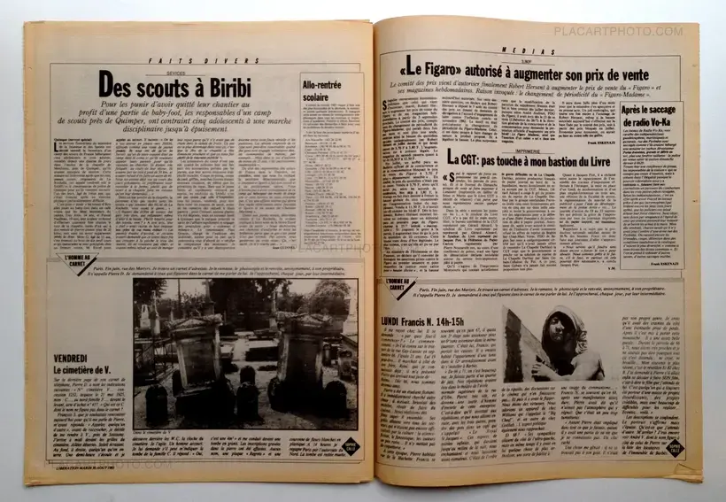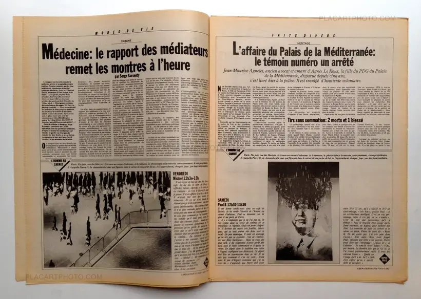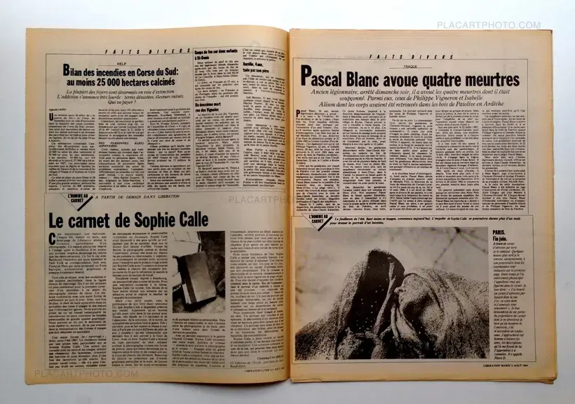 Facsimile of the newspaper Liberation from August 2, 1983, containing "The man with the book" by Sophie Calle. One day, Sophie Calle finds an address book in the street. Curious, she contacted all the people mentioned to talk about the owner of the book, then the descriptions are used as a portrait of the man.
