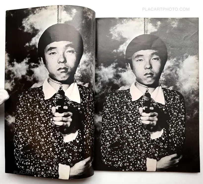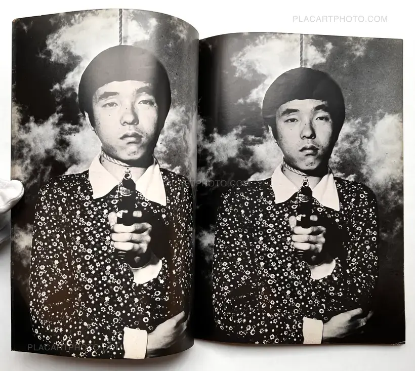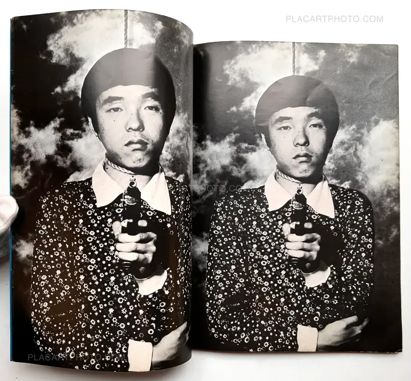 An obscure artist's book appearing with a rope around his neck and a gun aimed at the reader. Only the last image is a bit difference since the photo is zoomed out and a naked woman appears in the background holding the same picture of himself.