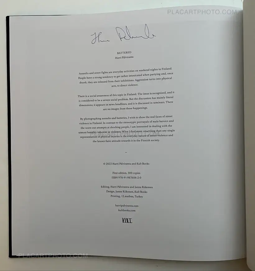 In the book Battered the Finnish Photographer Harri Pälviranta shows the real faces of street violence in Finland. In contrast to the stereotypic portrayals of male heroics and the worn-out attempts at shocking people, Pälviranta deals with the utmost banality inherent in violence.