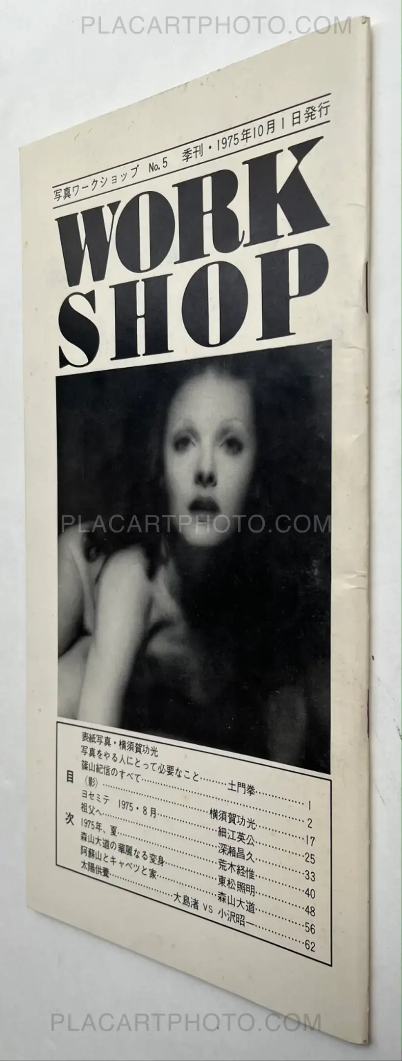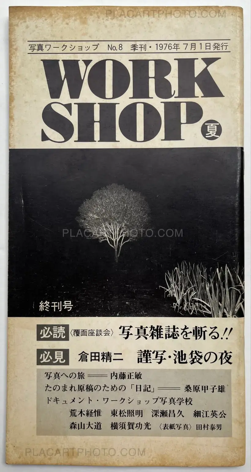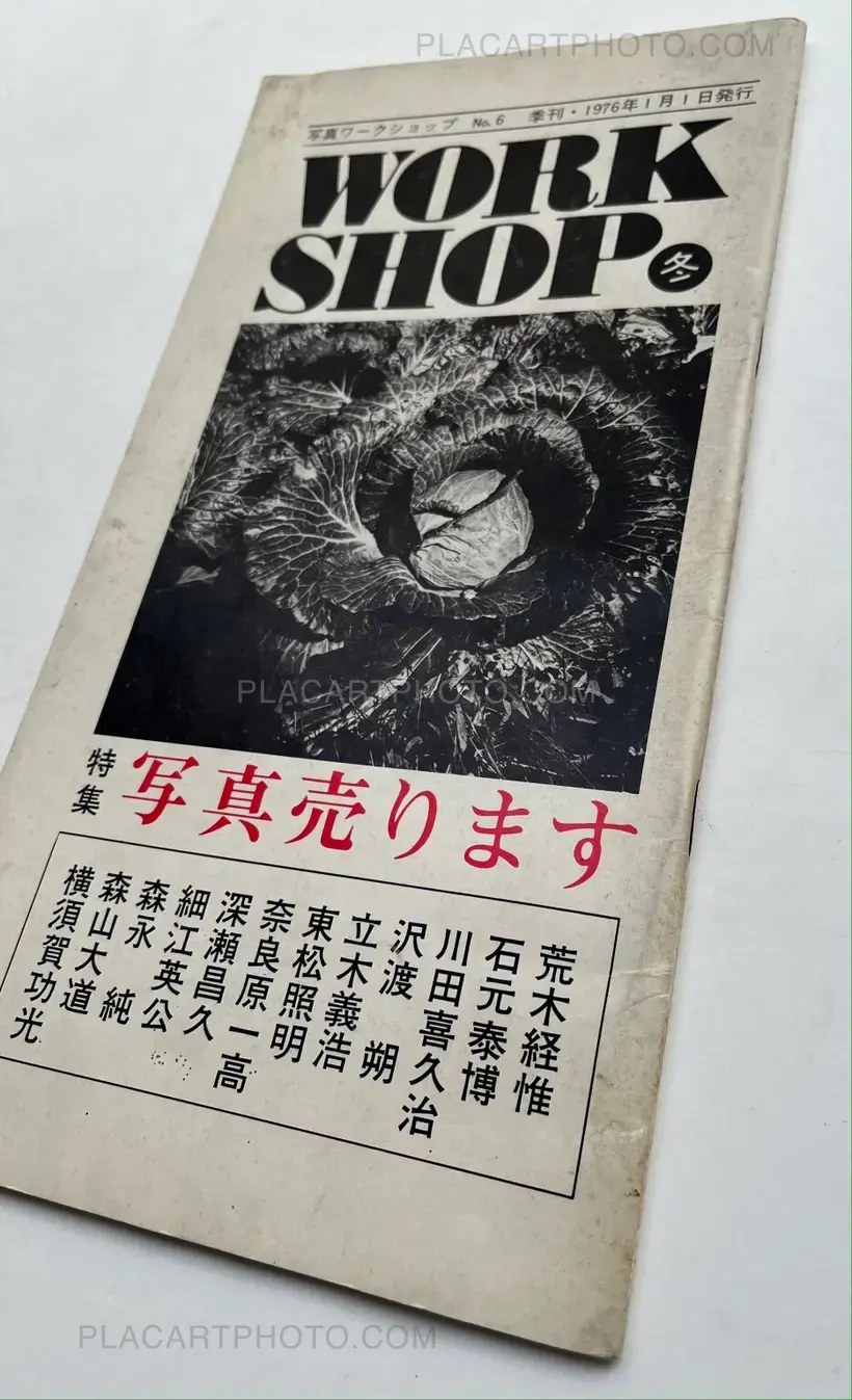 Workshop is the name of the photography school of which the first class was held April 22 1974. This school was comprised of classes by six important Japanese photographers: Nobuyoshi Araki, Shomei Tomatsu, Masahisa Fukase, Eikoh Hosoe, Daido Moriyama, and Noriaki Yokosuka, who also edited these issues. These last four editions of Workshop are stapled softcovers in vertical layout, and are comprised of photos, texts, and dialogues by these six photographers. The editing differs from the first four issues in that there is not necessarily a specific organization of the subjects depicted by the photographers.