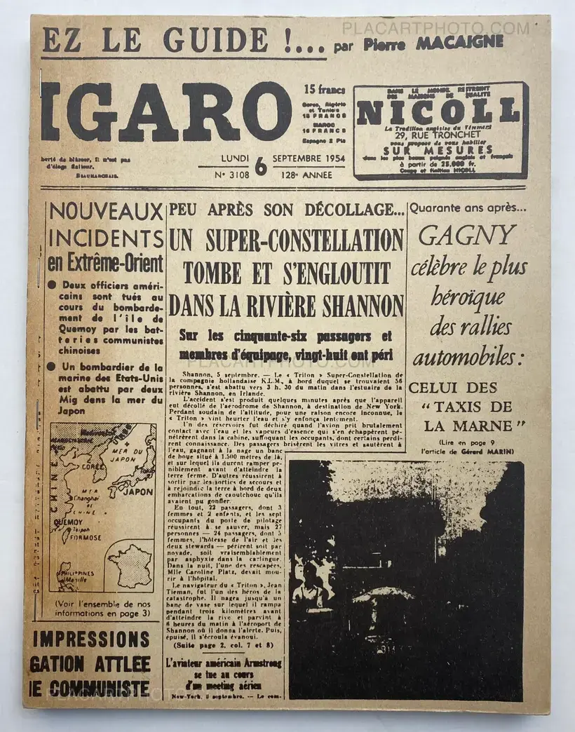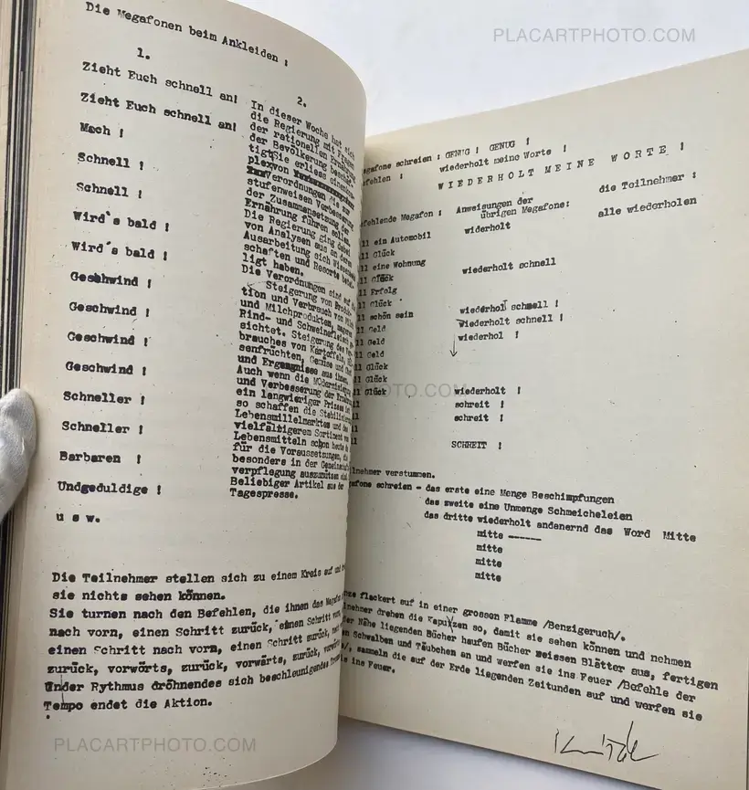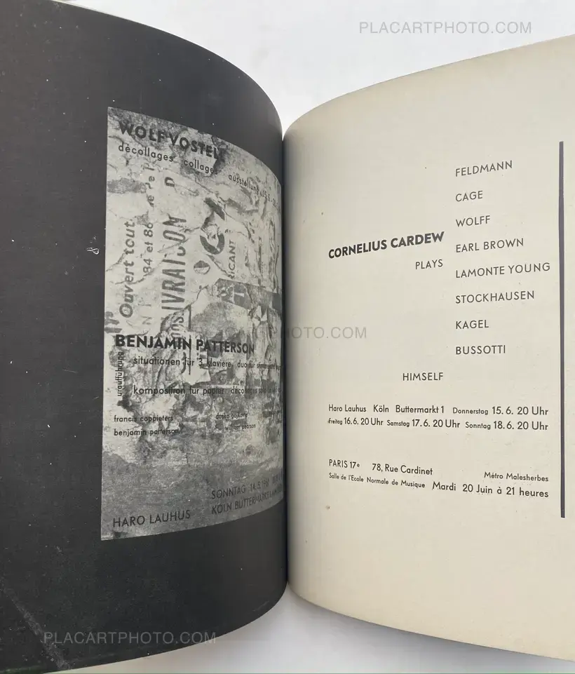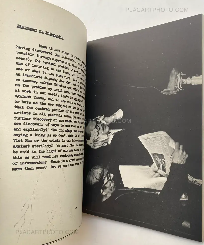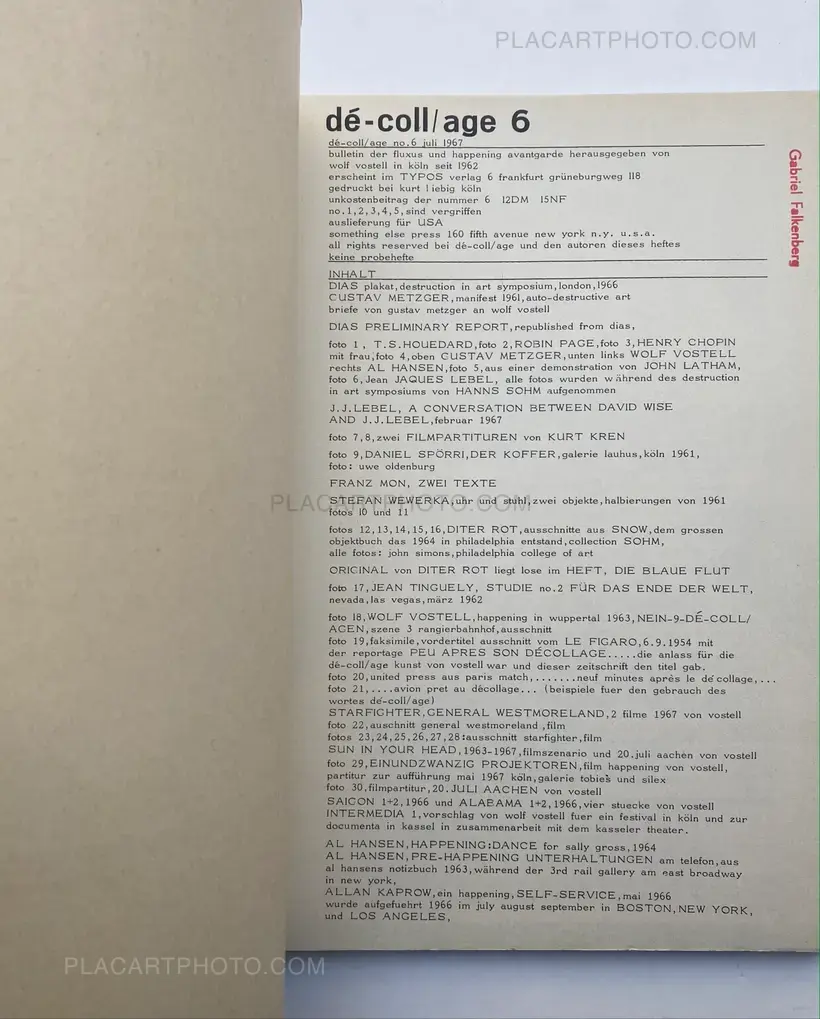 Dé-coll/age 6. Bulletin der Fluxus und Happening Avantgarde. Frankfurt am Main, Typos Verlag, 1967. Facsimile of a ‘Figaro’ front page from September 1954, used together with a brown cardboard as covers ( slightly yellowed ). Complete with the loosely inserted work (Multiple) ‘Das blaue Geheul (90 x 125 mm.- an intervention with a blue marker on photo paper by Dieter Roth (different in all copies). First edition of the last issue of this Fluxus- magazine. With contributions by – among other people – Daniel SPOERRI, Dieter ROTH, Jean TINGUELY, Wolf VOSTELL, Al HANSEN, Dick HIGGINS, Allan KAPROW, Ben VAUTIER and Peter O. CHOTJEWITZ with a Manifest (of 12 pages) : Plädoyer für die Kunst. Fluxus.