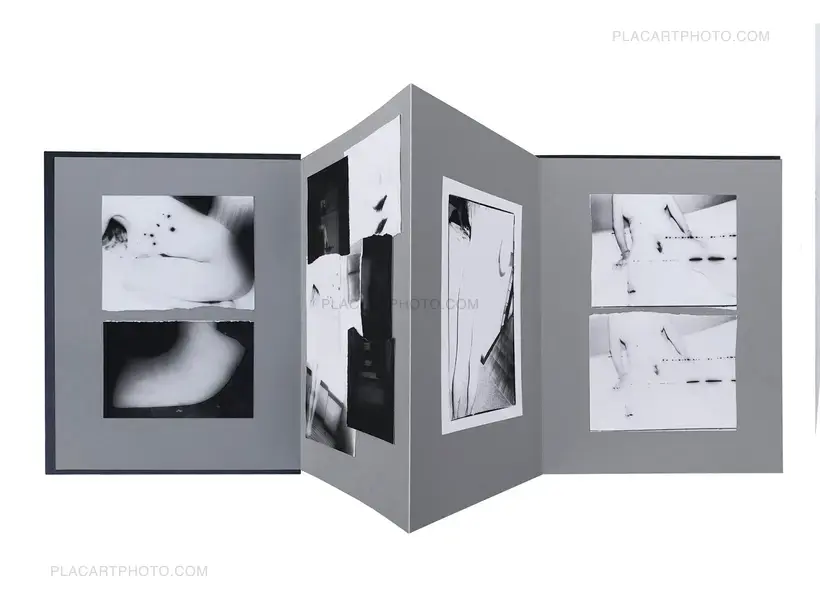 The cover of each edition has a torn darkroom fragment from the original ‘bones apart’ darkroom sessions (03/21) - black for the black edition, white for the white edition, grey for the grey - affixed to the bottom right hand corner so the collector knows which is the front cover & which way around the book goes. All 3 leporellos are tied together to prevent the pages and work from spilling out onto the floor etc (it’s a 9 meter long concertina!) with the same grey material for each edition. Another unifying element - among many.