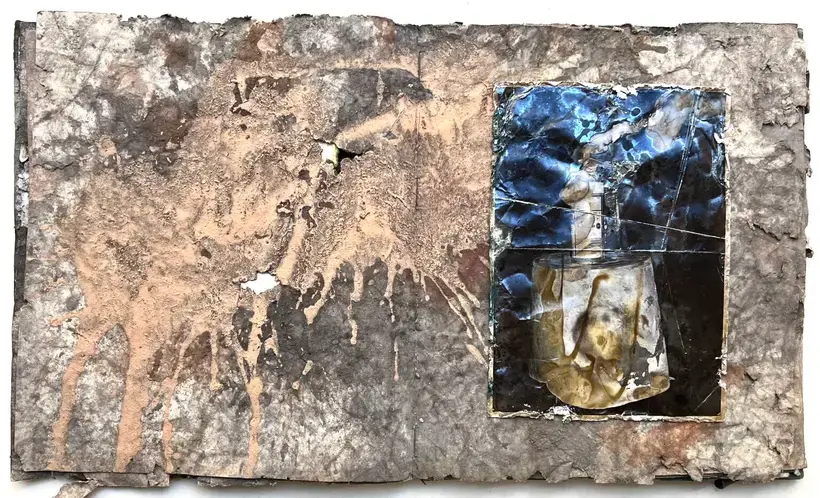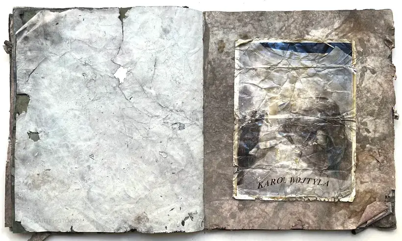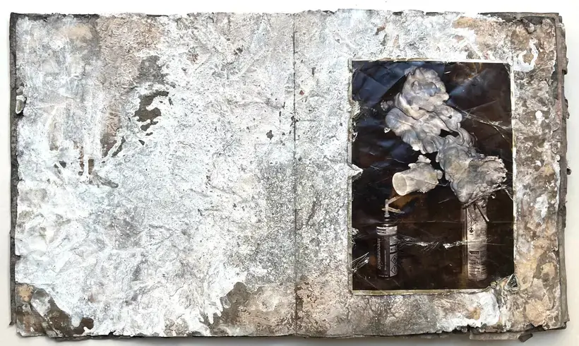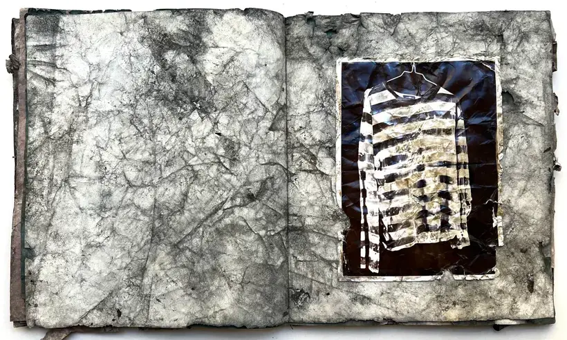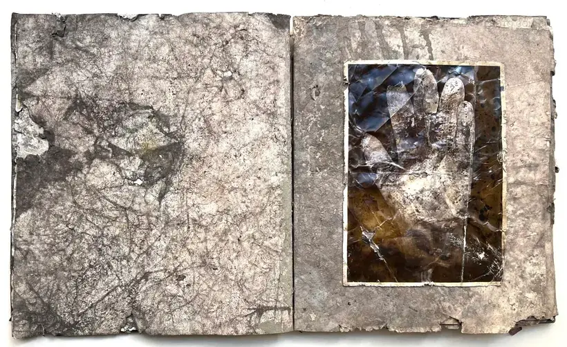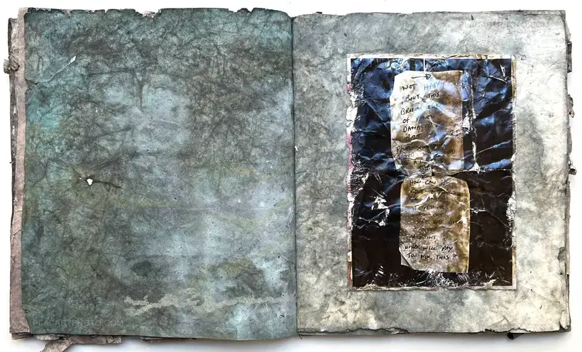 Fail Again/Fail Better. The pages are made from decorator's wallpaper that have been stained with pigment, cement and gypsum plaster all items you find on a building site. Each book is approximately 33cm x 28cm and contains 17 hand printed photographs printed on Ilford RC paper. The book is an edition of 10 with title pages lino printed and a cement covered cover.