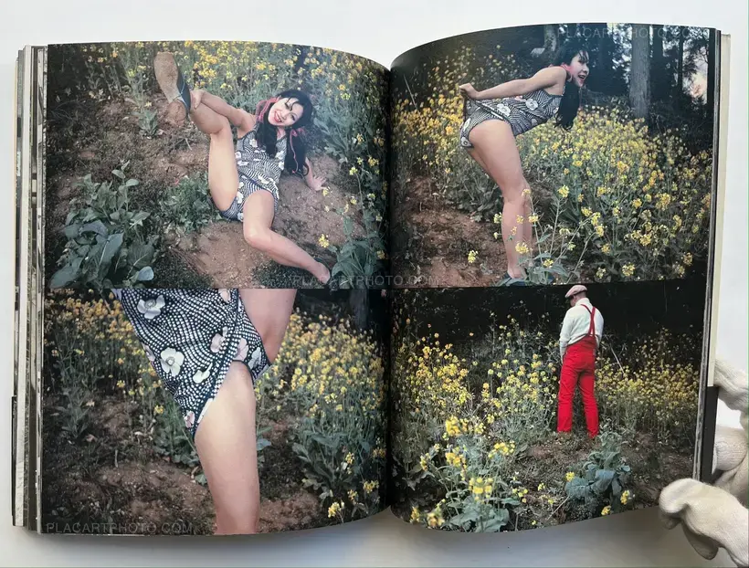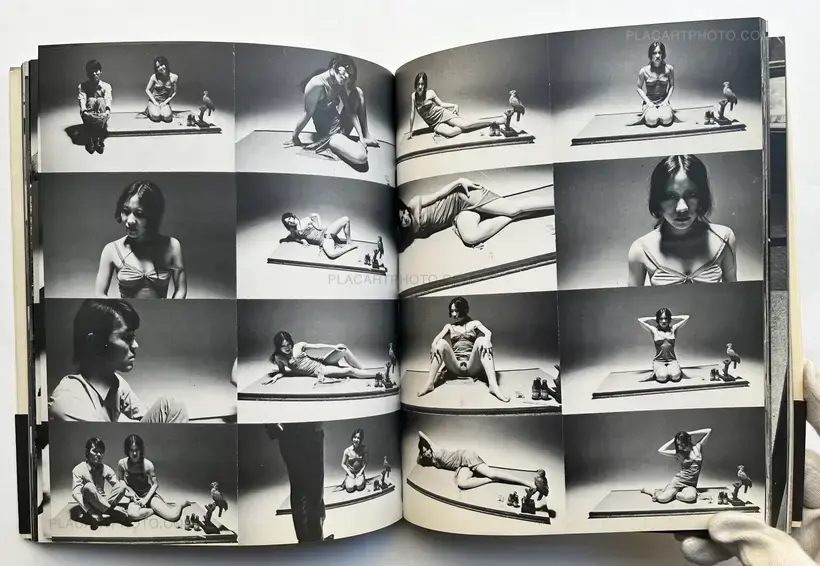 Many images in sequence, mostly black and white and shot between 1967-1972, with several iconic photographs interspersed among those previously unpublished. The juxtaposition of a highly charged erotic series followed by somber shots of Araki's father's funeral is indicative not only of Araki's artistic prowess, but also of the inherent risk taking that infuses the best of the Japanese photobooks. The layout is reminiscent of contact sheets or film stills, creating a dynamic composition.