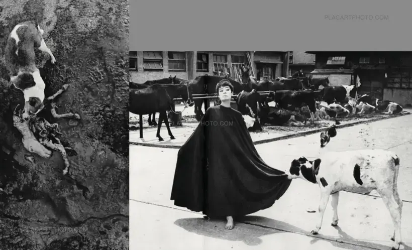 - To (Slaughter) features images of Yoko Wanibe, whom Fukase accompanied to a slaughterhouse, juxtaposing the dismemberment of livestock with Yoko posing in a black cloak.
