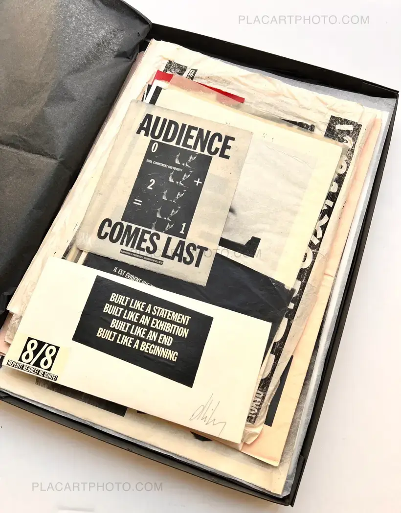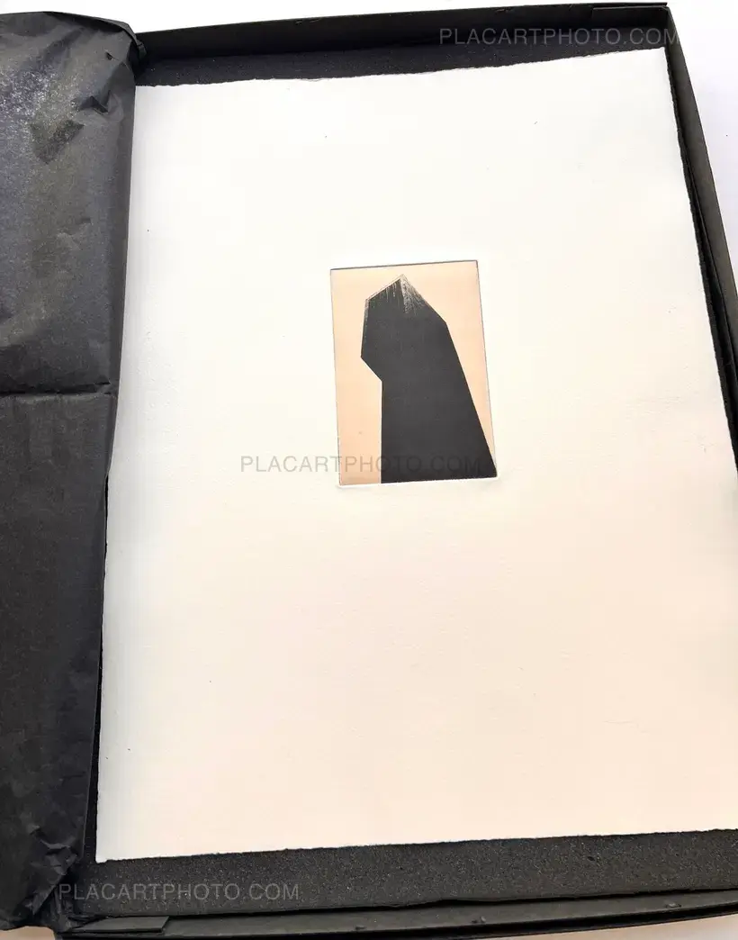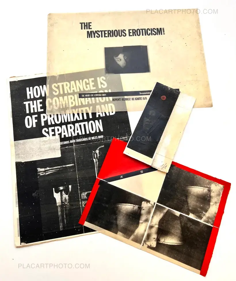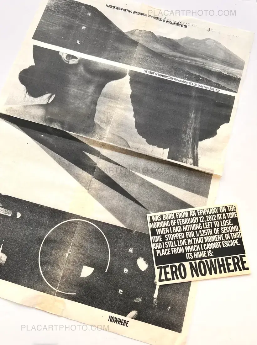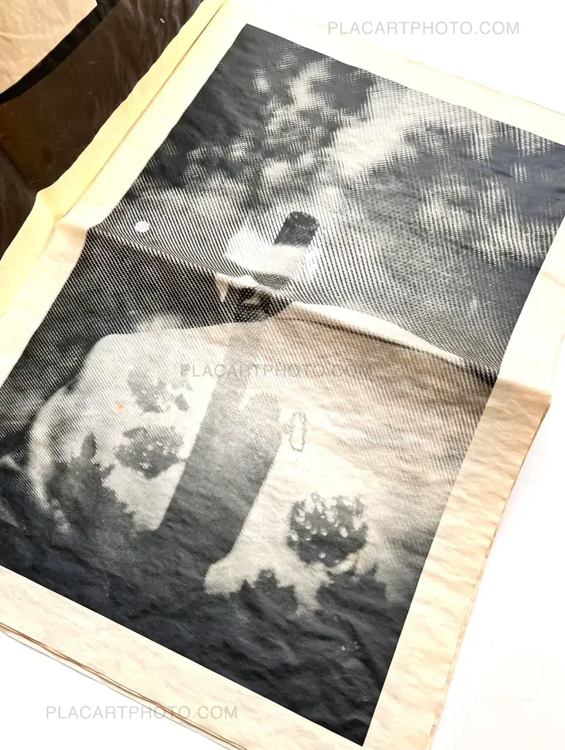 Various document in a box. Size from A6 to 50x75cm. 2 broadsheets and 1 tabloid. Including posters, collages, handmade research using different techniques (paint, wax, laser), mostly printed on kozo, ganpi, and kitakata paper. Enriched copy of several items, including an engraving print on ganpi paper. Edt of 8