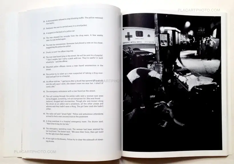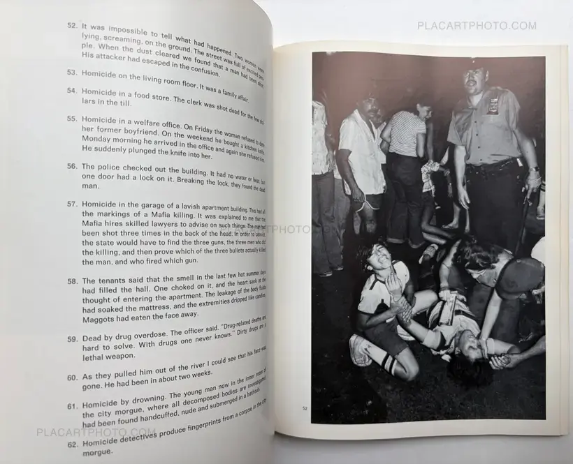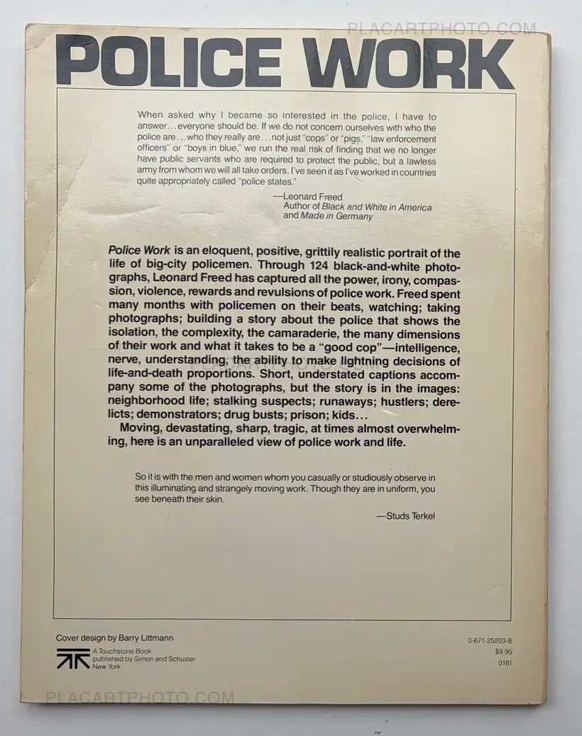 Police Work is an eloquent, positive, grittily realistic portrait of the life of big-city policemen.Through 124 black-and-white photographs, Leonard Freed has captured all the power, irony, compassion, violence, rewards and revulsions of police work. Freed spent many months with policemen on their beats, watching ; taking photographs ; building a story about the police that shows the isolation, the complexity, the camaraderie, the many dimensions of their work and what it takes to be a "good cop" - intelligence, nerve, understanding, the ability to make lightning decisions of life-and-death proportions. Short, understated captions accompany some of the photographs, but the story is in the images : neighborhood life ; stalking suspects ; runaways ; hustlers ; derelicts ; demonstrators ; drug busts ; prison ; kids...