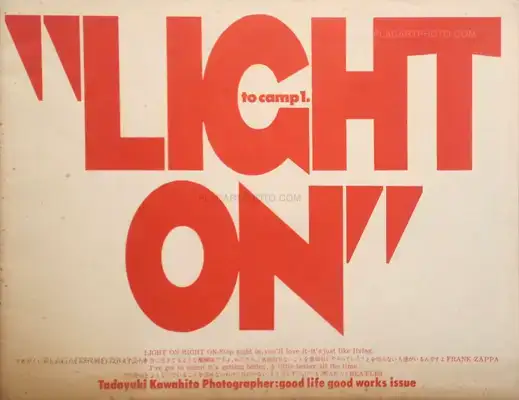 To camp 1. "Light on" was the first volume of a series of six books Tadayuki Kawahito had planned to do. This unusal photobook presents catchy pictures of women, often nude, in rooms, even in a market and...one man. Extracts of quotes by Frank Zappa and The Beatles added on the cover give to the photobook its tone : "good life good works issue" wrote Tadayuki Kawahito.